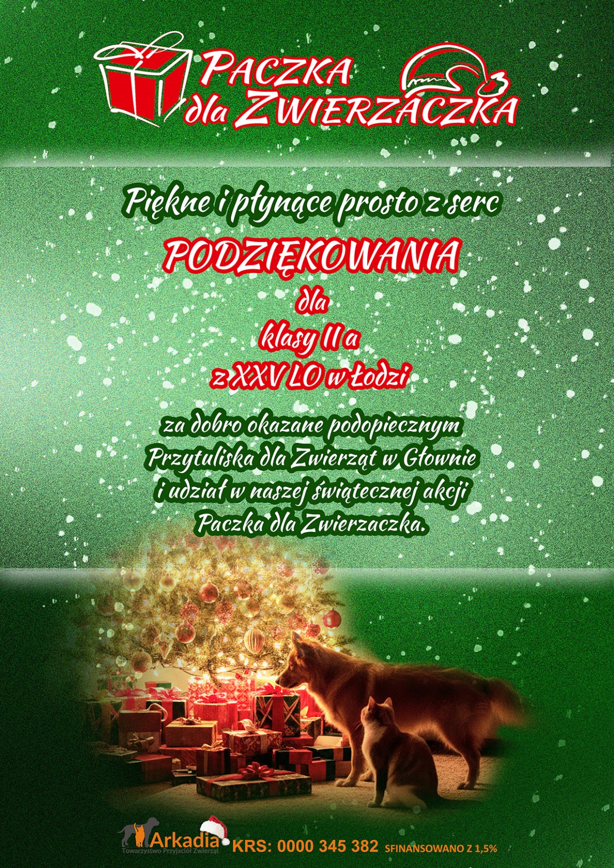 Kolejny raz uczniowie klasy II A wraz z wychowawczynią panią Natalią Rajczak wzięli udział w akcji „Paczka dla zwierzaczka” i przygotowali świąteczne prezenty dla Szczęściarza i Kruszonki – psa i kota z Przytuliska w Głownie. Mamy nadzieję, że zwierzaki szybko znajdą swojego człowieka, który podaruje im nowy, wmarzony dom. Zachęcamy do zapoznania się z ich historią na stronie Przytuliska.